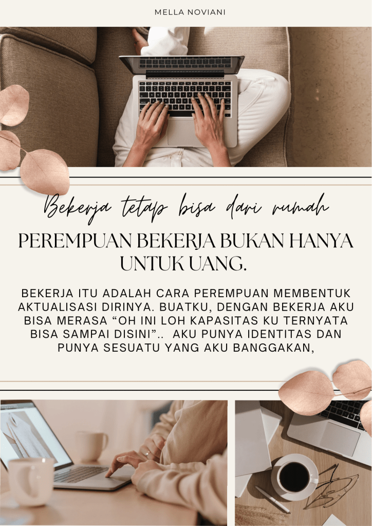 Bukan hanya perempuan yang bekerja di sektor formal saja, ibu rumah tangga pun atau perempuan yang bekerja di sektor informal bisa mencapai aktualisasi diri dengan bekerja dirumah saja (Work From Home). Bekerja WFH di sela – sela mengurus anak – anak, suami dan tugas harian rumah tangga kamu. Apalagi sekarang sudah jaman digitalisasi, jadi lebih mudah untuk melakukan pekerjaan dari rumah saja dan mendapatkan penghasilan agar kamu bisa membantu diri kamu sendiri bahkan keluarga, kalau punya suami itukan tugas suami, yes bener banget !!, tapi ingat aktualisasi diri salah satu syaratnya adalah kita tidak mengandalkan orang lain tapi mandiri dari diri kita sendiri.